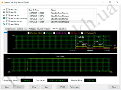 Разберём, что происходило в стресс-тесте. При полной нагрузке, вне зависимости от режима работы (АКБ (аккумуляторная батарея) или БП (блок питания)), кратковременно, теплопакет увеличивался до 30 Вт (на 5 – 10 секунд) и после этого, снижался до 25 Вт. При этом, в любом из режимов, максимальная температура составила 86 градусов. Но отмечу, что стресс-тест начинался с температур в районе 41-45 градусов (что видимо повлияло на разницу в результатах), но при другой, более высокой, базовой температуре, возможны пики до тех самых 93,5 градусов. При этом, после увеличения режима работы вентиляторов, температура упала с пиковой до 77 градусов при работе от АКБ и до 80 градусов при работе от БП (такие устоявшиеся температуры будут и после более высоких пиковых температур). Возможно, данная разница вызвана или погрешностью или зарядкой АКБ в ноутбуке.