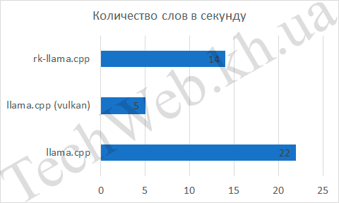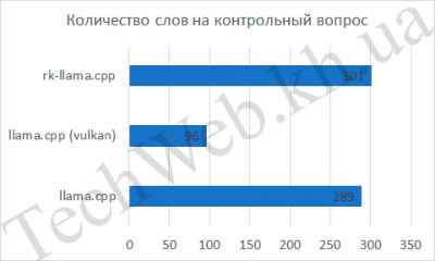 Проанализируем те параметры, которые можно вытащить из ответа нейросети, а это скорость обдумывания ответа, количество слов, скорость ответа и, исходя из 2-х предыдущих величин, количество слов в секунду. Для rk-llama и llama.cpp скорость обдумывания была равна 0, в то же время, встроенная графика была на 5 с медленнее. Если количество слов и время выдачи ответа не так интересны (они нужны просто как наглядные данные, чтобы было понятно, как высчитывалось следующее значение), так как следующий график более показательный – количество слов в секунду. По нему видно, что llama.cpp занял первое место с отрывом в 57%, по сравнению с rk-llama.cpp и в 4,4 раза, по сравнению с API Vulkan.