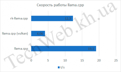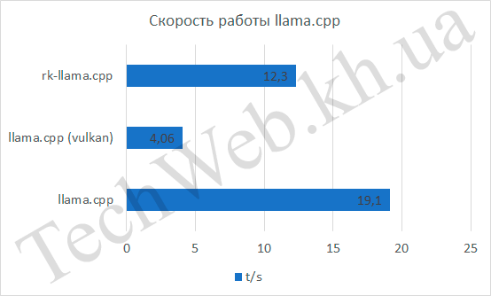 API Vulkan оказался аутсайдером, отстал лидера в 4,7 раза, на втором месте rk-llama.cpp, который отстал в 1,5 раза, а на первом месте оказался llama.cpp, который работал на CPU. С первым понятно – он работает кое как, со вторым не так всё просто, видимо сказывается низкая скорость в tg128. Ниже приведу и другие параметры, которые были получены при тестировании c этим же вопросом.