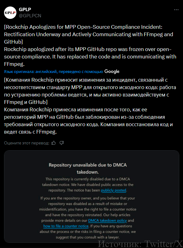 Некоторые источники писали о том, что Rockchip вероятно ничего исправлять не будет. Однако, никто толком не обратил на это внимание, что 27 февраля (если судить по дате из twitter/x) компания принесла извинения и пошла на контакт с командой ffmpeg. В результате (если судить по активности в репозитории) в начале марта репозиторий был разблокирован.